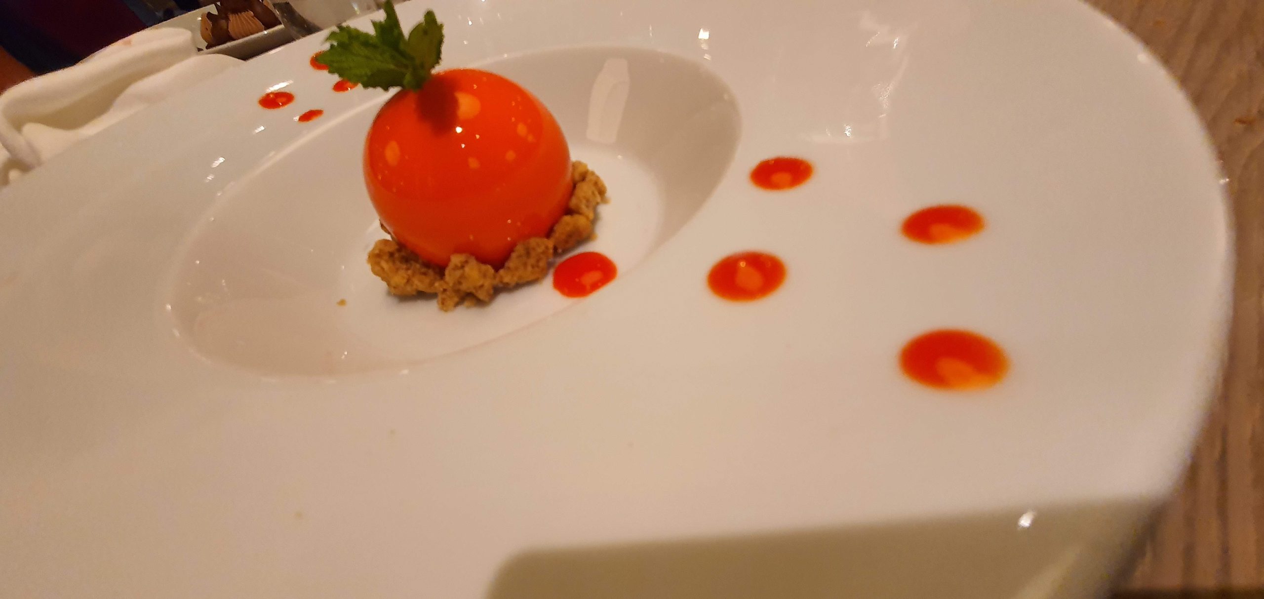 La cena está muy bien, platos muy elaborados. Tenemos cada noche un entrante, un primer plato, un plato principal y un postre. Siempre la misma mesa donde nos atienden los mismos camareros.