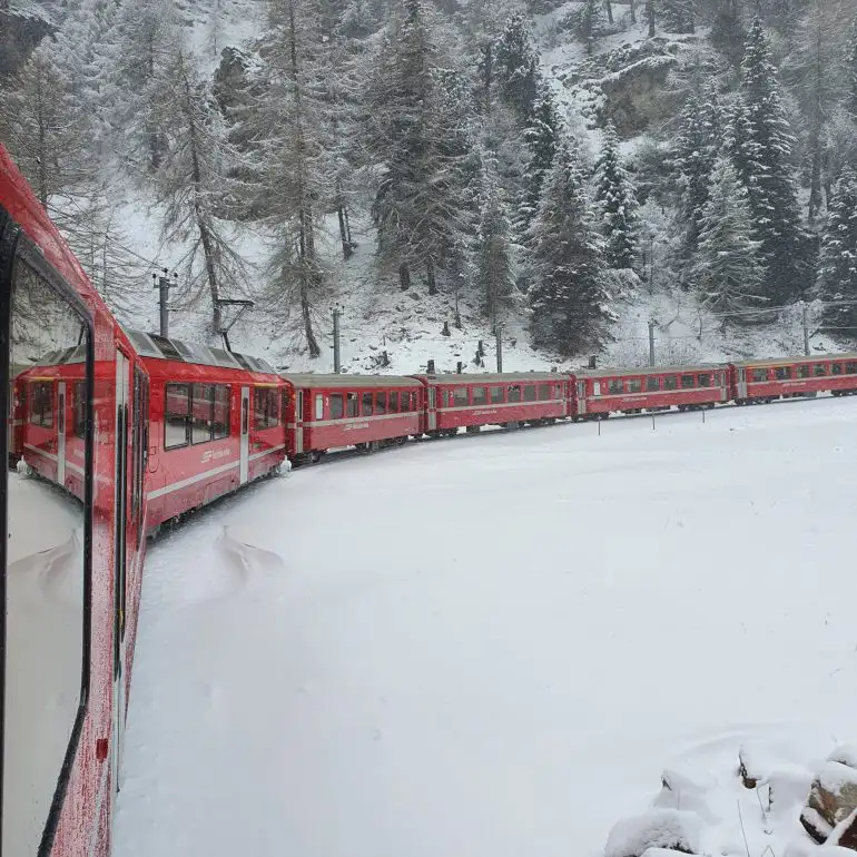 - Parada en St. Moritz: En el trayecto desde Chur a Tirano, el tren hace una parada en St. Moritz, uno de los destinos de esquí más exclusivos de Suiza. Los pasajeros pueden hacer una breve parada para explorar esta famosa ciudad alpina antes de continuar su viaje. En nuestro caso St Moritz era el punto final del trayecto por lo que aprovechamos para visitar la ciudad nevada.