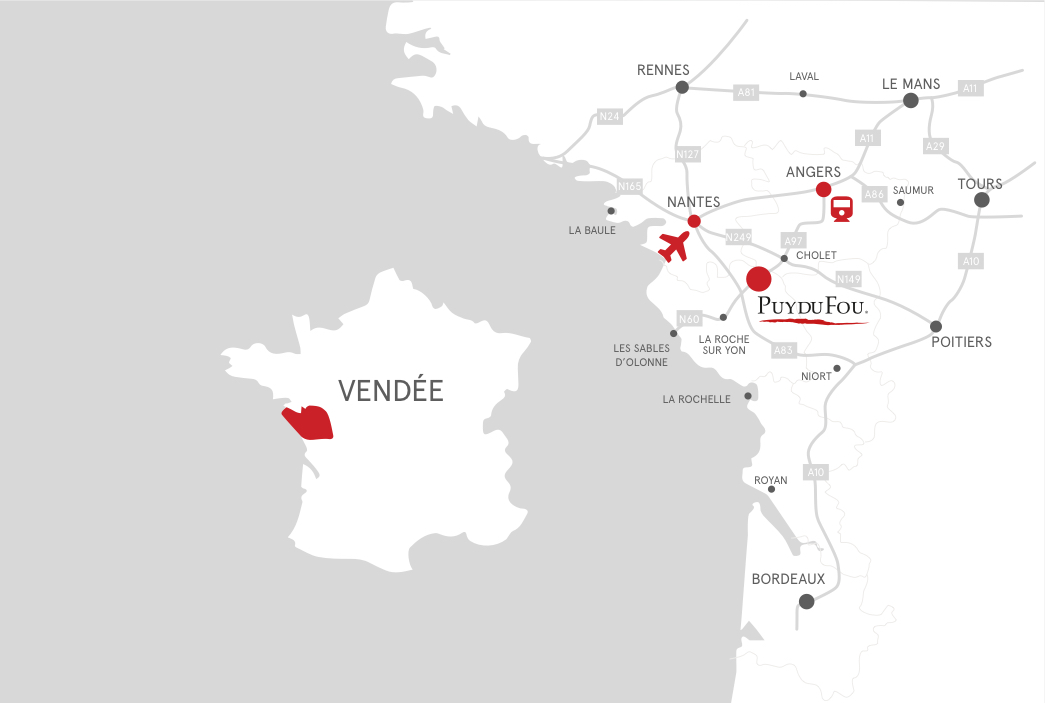 Está situado a 3:15 h de París, 3 h de Burdeos y 2 h de Poitiers. Se puede llegar en coche, TGV o avión. En TGV la estación más cercana es Angers desde donde se pueden contratar unas lanzaderas (de pago) que nos llevan a parque en 1:30 h. Si queremos ir en avión el aeropuerto más cercano es el de Nantes, a una hora y comunicado con Madrid y Barcelona.