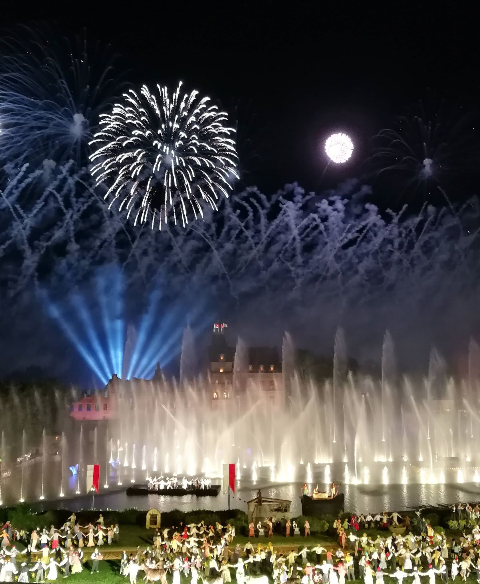 Un grandioso espectáculo nocturno, La Cinescenie que, aunque de pago aparte y caro, pensamos que es imprescindible. Con más de 3.000 personas actuando, 24.000 cambios de vestuario, en un marco histórico tan perfecto que se hace difícil describirlo con palabras, se recorre una buena parte de la historia de Puy du Fou, desde la época de los caballeros, la vendée que se enfrentó a los partidarios de la revolución hasta las últimas grandes guerras.